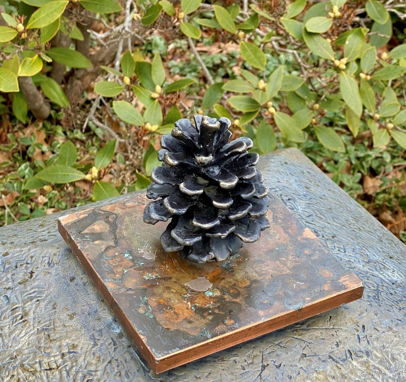 Each piece is coated with a thin layer of lacquer which helps to protect the patina.