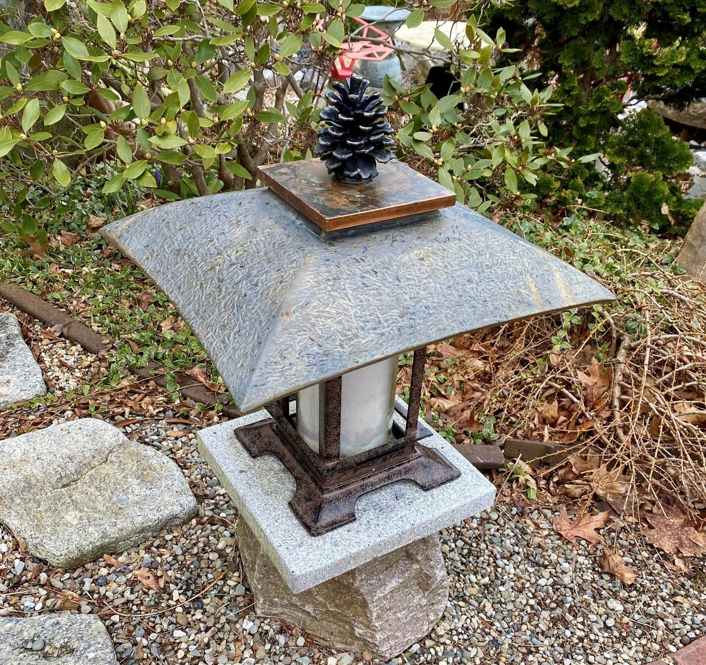 The luxurious Ponderosa Cone, adorning the Japanese-style lantern, was crafted by a customer of TB53. Its bronze sink bowl, ingeniously inverted, creates a stunning shade. Such ingenuity is truly artistic.