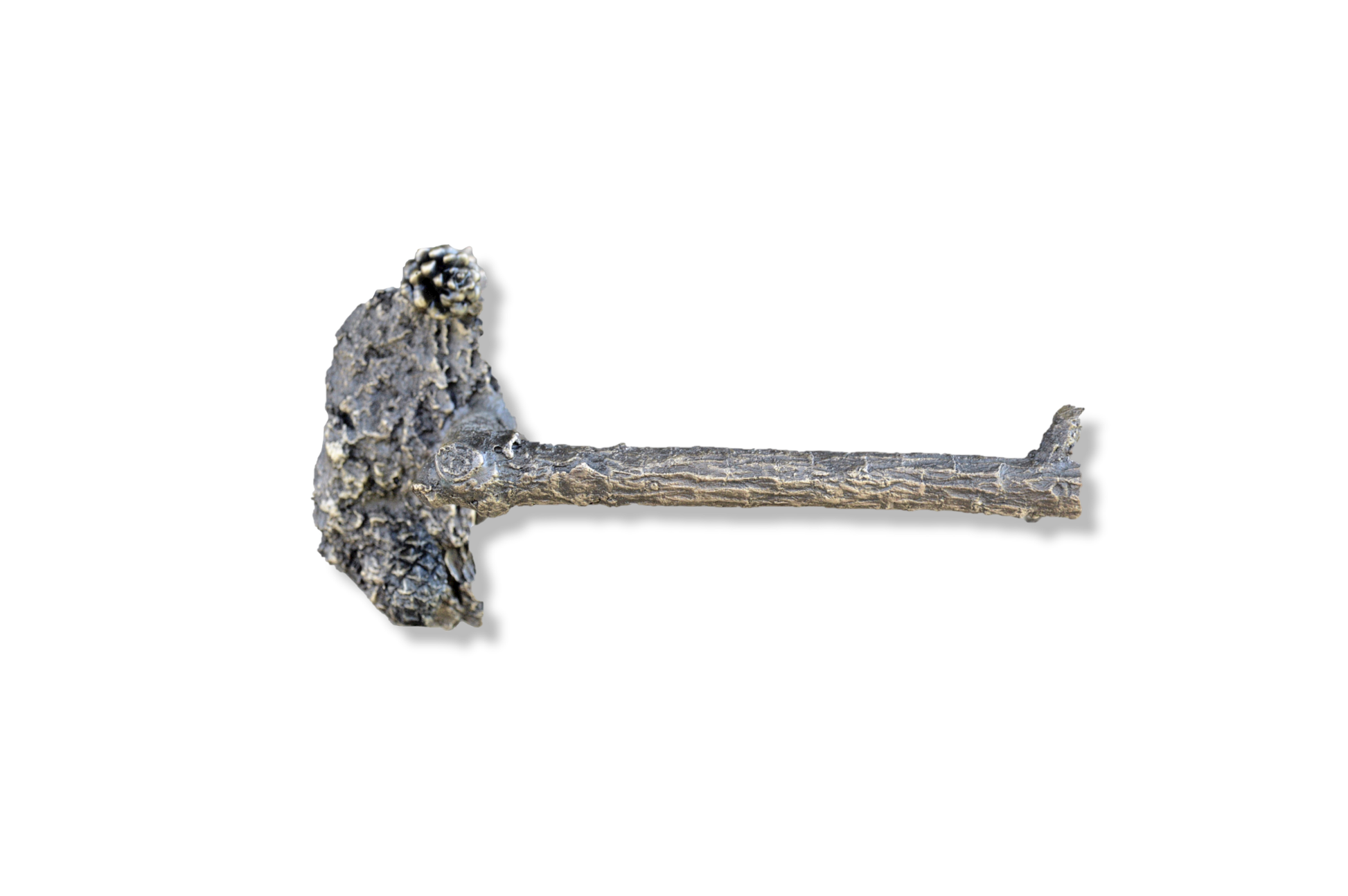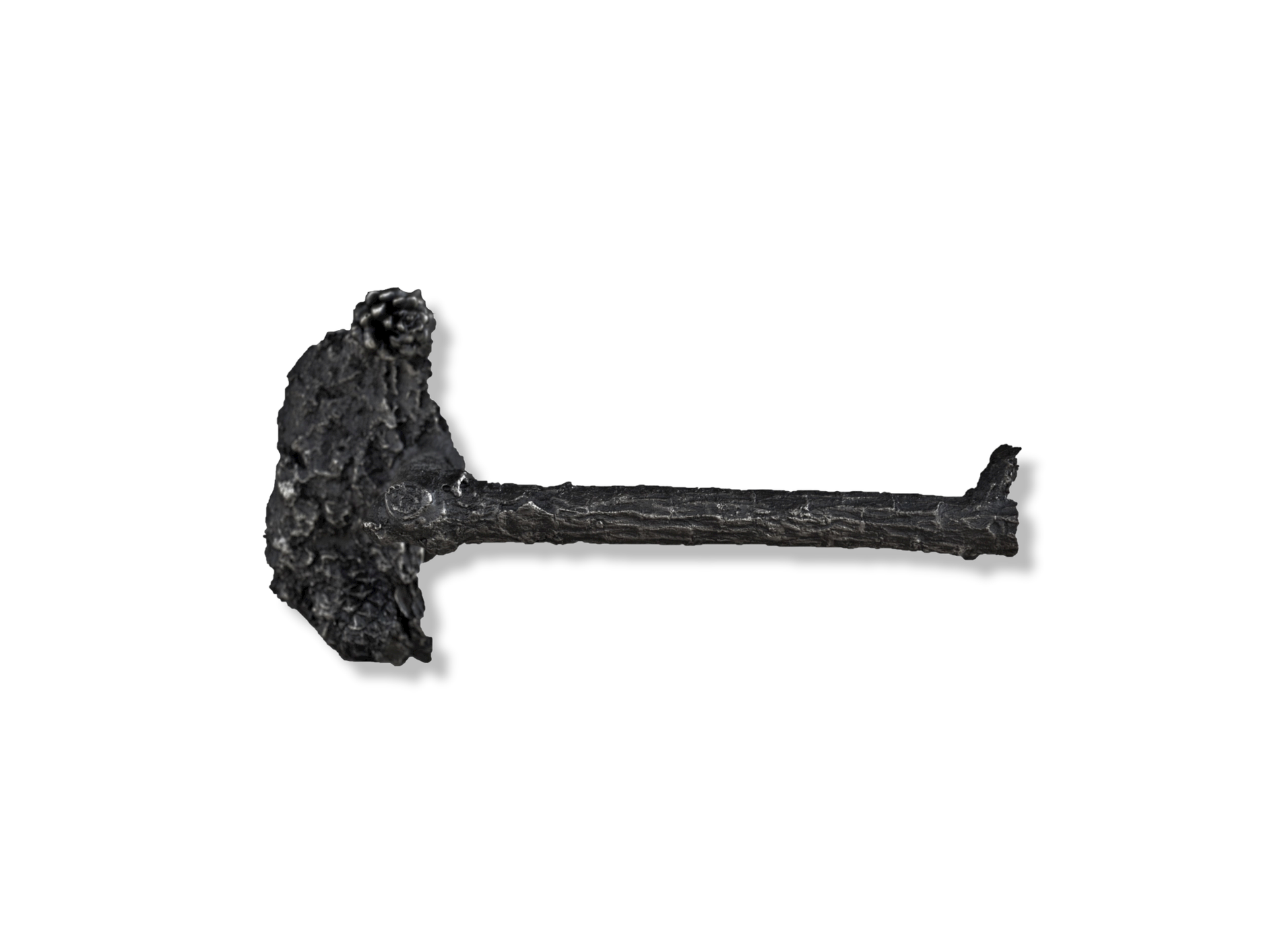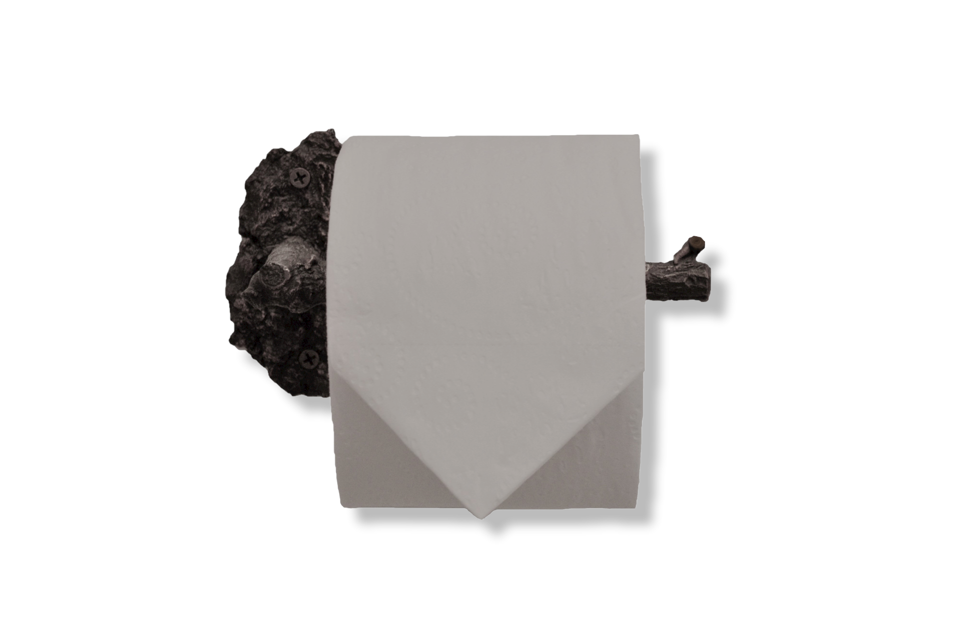 The 3/8" diameter pine branch used for this solid bronze lodgepole toilet paper holder is plenty strong for the intended purpose. Although it appears "finer" and weighs almost 50% less, this custom rustic toilet paper holder will still hold a full size roll of tissue. The pine branch is mounted on a vertical, moderately textured pine bark base. The base attaches to the wall with hanger bolts on the back of one tiny open and one small closed Lodgepole cone - no unsightly screws. Suitable for either wood or studded walls. Mount in a protected space for safety.