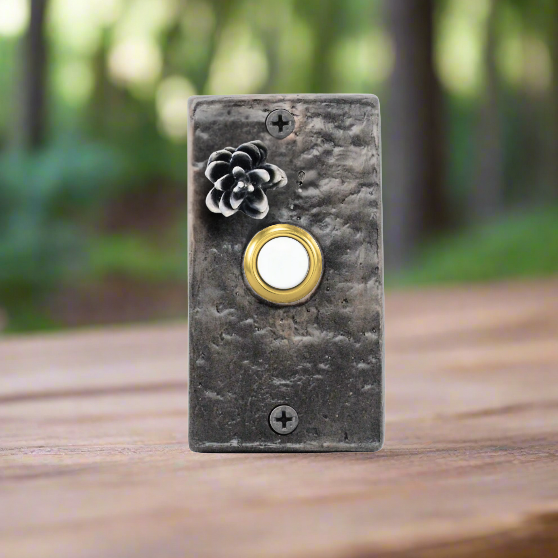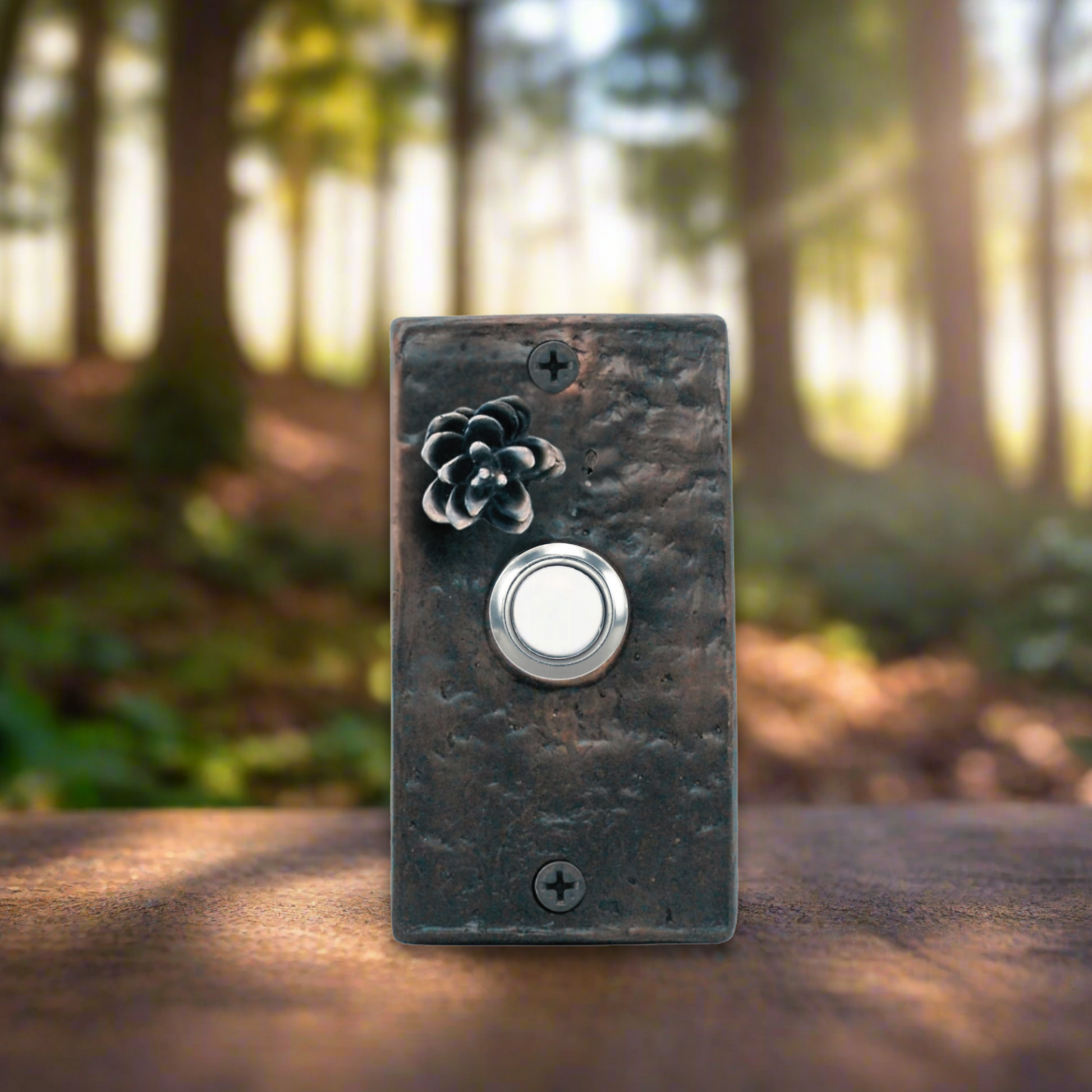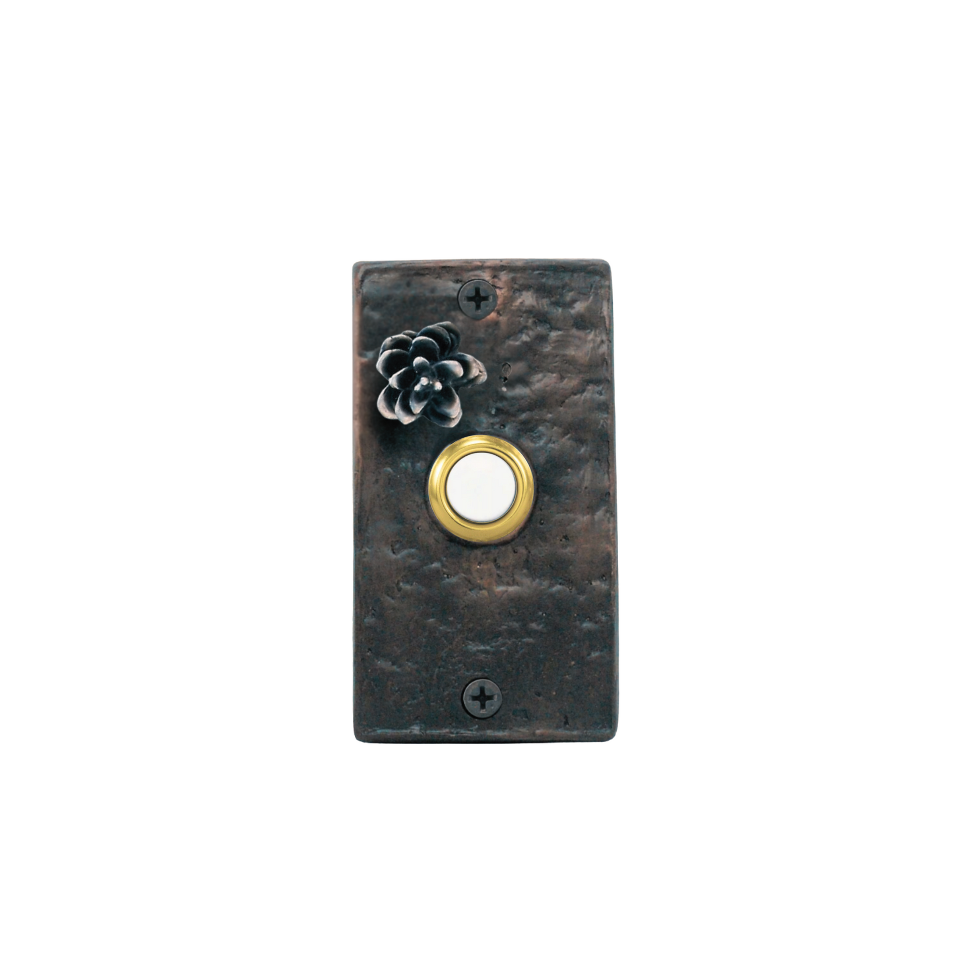 Welcome guests in style with this elegant rectangle western hemlock doorbell. Crafted from bronze and featuring a tiny western hemlock cone, this rustic bronze doorbell makes a sophisticated statement while also providing a convenient, lighted push button for visitors. Add a touch of luxury to your home with this exquisite doorbell.