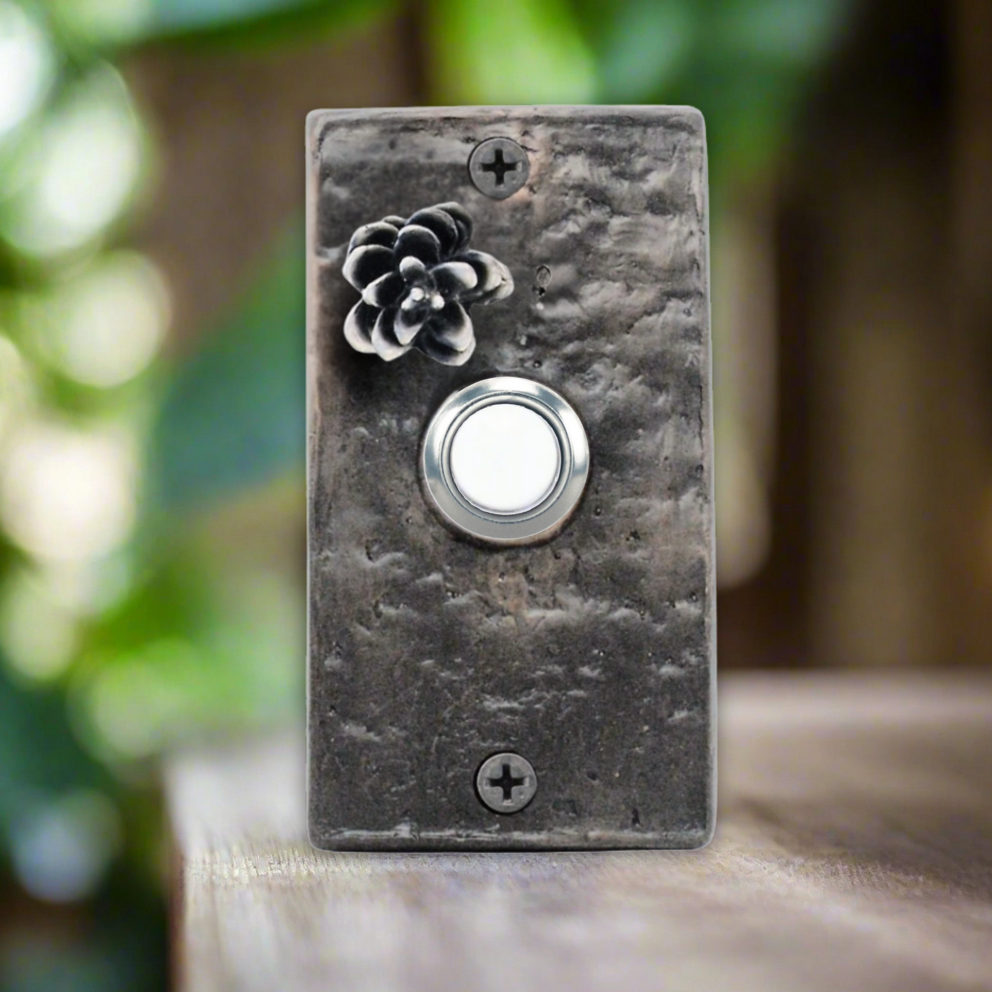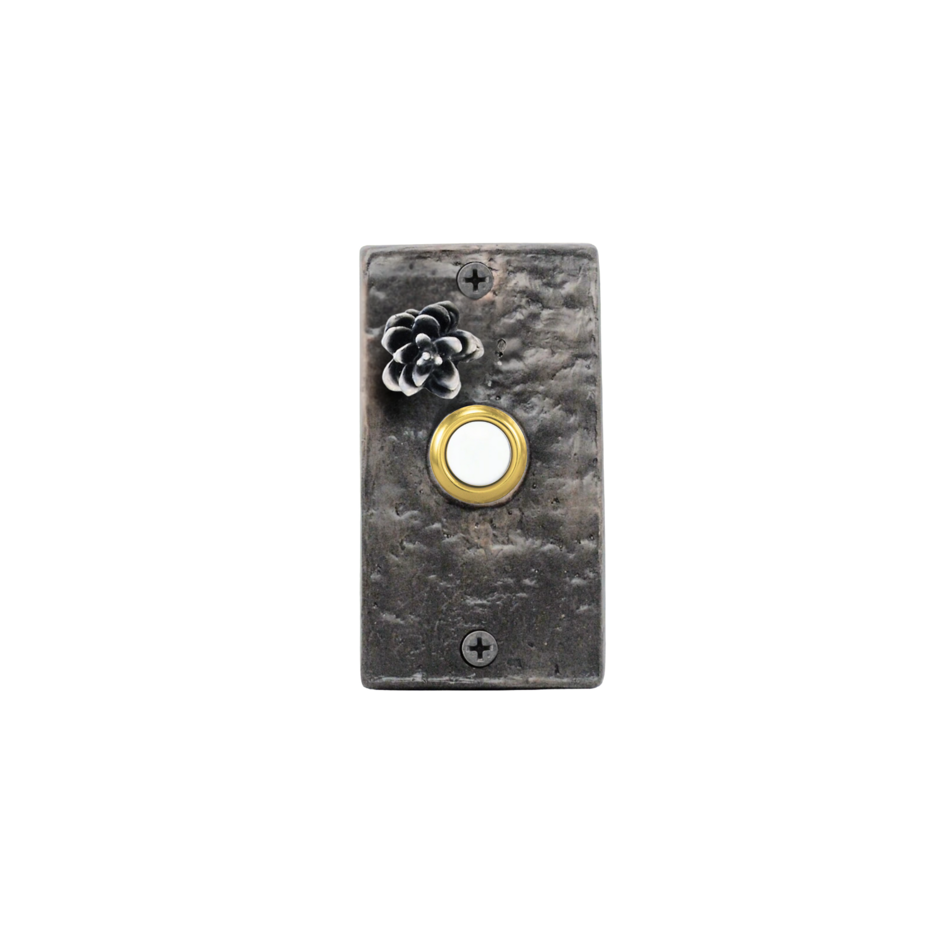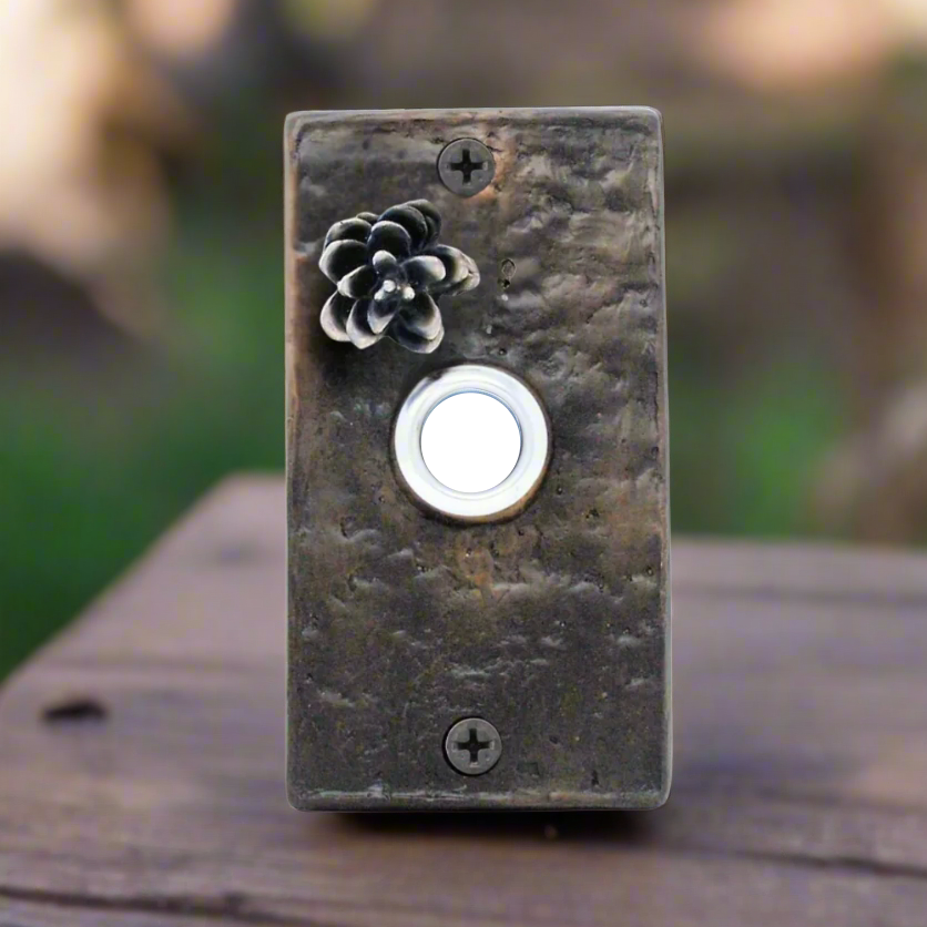Welcome guests in style with this elegant rectangle western hemlock doorbell. Crafted from bronze and featuring a tiny western hemlock cone, this rustic bronze doorbell makes a sophisticated statement while also providing a convenient, lighted push button for visitors. Add a touch of luxury to your home with this exquisite doorbell.