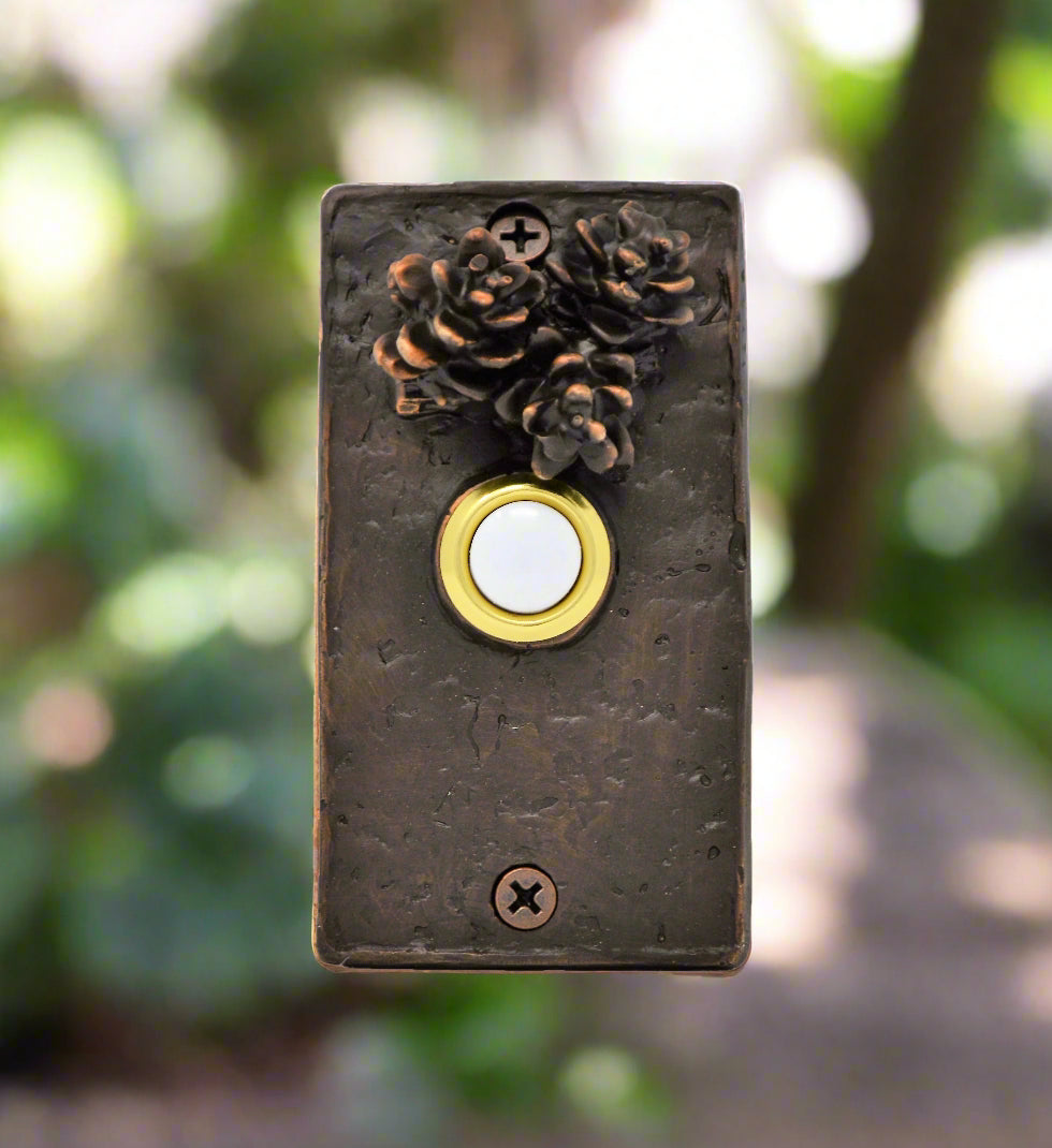 Welcome your guests with a stylish and durable rustic bronze doorbell! This rectangle western hemlock doorbell features three western hemlock cones, providing a beautiful and welcoming atmosphere with its natural rustic grain. Enjoy a classic look and feel with the strength and reliability of bronze.