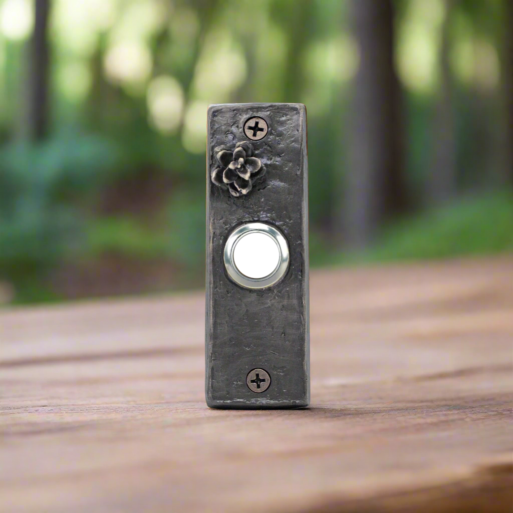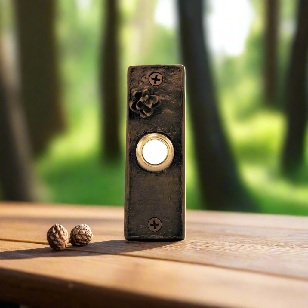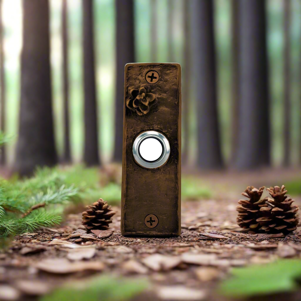 Introducing our slim western hemlock cone doorbell, a custom rustic doorbell designed with sophistication and exclusivity in mind. With its slim and sleek design, this doorbell adds a touch of luxury to any home. Elevate your entrance with our elegant and tasteful doorbell.